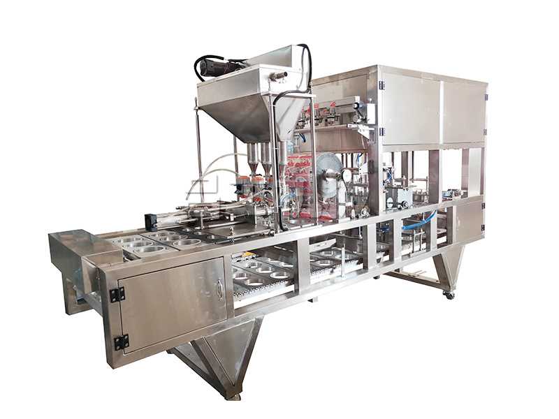 本機(jī)采用合理的機(jī)械傳動,功能齊全,灌裝、封口、切邊、制品推出,廢料收卷,印碼等自動化工作,可節(jié)約人力,降低成本。本機(jī)有二次熱封裝置,料杯/碗/盒與封膜經(jīng)過前后二次熱封,封口牢固可靠。