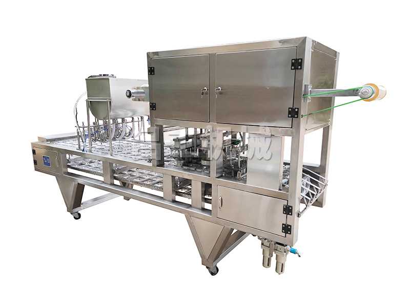 本機采用合理的機械傳動,功能齊全,灌裝、封口、切邊、制品推出,廢料收卷,印碼等自動化工作,可節約人力,降低成本。本機有二次熱封裝置,料杯/碗/盒與封膜經過前后二次熱封,封口牢固可靠。